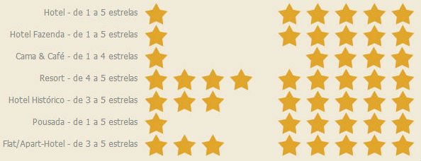 Como la realidad de los hoteles en Brasil es diferente a la realidad de una pousada, se definió un sistema de clasificación adaptado a cada segmento. A continuación detallamos el ranking utilizado para cada segmento de hospedaje en Brasil:
